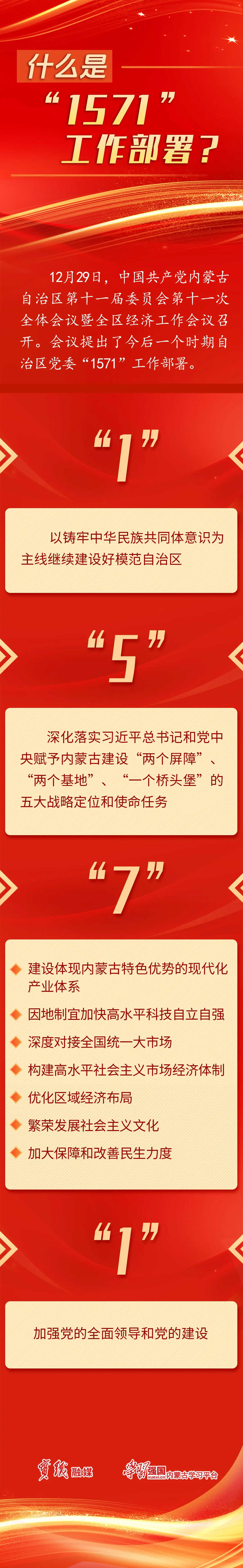 自治區(qū)黨委常委會深刻領會習近平總書記對內蒙古的殷殷囑托,深入分析內蒙古發(fā)展的階段性特征,綜合各方面意見建議,在過去工作的基礎上,形成了今后一個時期自治區(qū)黨委“1571”工作部署,即以鑄牢中華民族共同體意識為主線繼續(xù)建設好模范自治區(qū),深化落實習近平總書記和黨中央賦予內蒙古建設“兩個屏障”、“兩個基地”、“一個橋頭堡”的五大戰(zhàn)略定位和使命任務,抓好建設體現(xiàn)內蒙古特色優(yōu)勢的現(xiàn)代化產(chǎn)業(yè)體系、因地制宜加快高水平科技自立自強、深度對接全國統(tǒng)一大市場、構建高水平社會主義市場經(jīng)濟體制、優(yōu)化區(qū)域經(jīng)濟布局、繁榮發(fā)展社會主義文化、加大保障和改善民生力度七項重點工作,加強黨的全面領導和黨的建設。內蒙古同全國一道基本實現(xiàn)社會主義現(xiàn)代化的路徑更加清晰、抓手更加明確。這些成績的取得,根本在于以習近平同志為核心的黨中央領航掌舵,在于習近平新時代中國特色社會主義思想科學指引,是全區(qū)上下共同奮斗的結果。